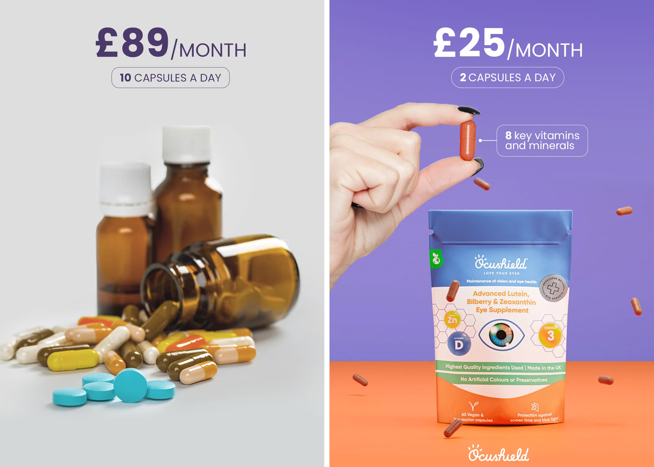 The Ocushield advanced 360 eye supplement is rich in vegan Omega 3 fatty acids allowing you to beat dry eyes syndrome as well as Lutein, a natural antioxidant, which helps prevent macular degeneration. Furthermore the advanced eye supplement is packed with Vitamin D, Zinc Bisglycinate, Bilberry and Zeaxanthin to support eye health and the maintenance of vision.. Developed by optometrists and ophthalmologists in the UK. No artificial colours or preservatives. We live in a world where high levels of screen time and numerous visual demands, Ocushield's 360 advanced eye supplement has got you covered to support your day to day vision and night time driving.